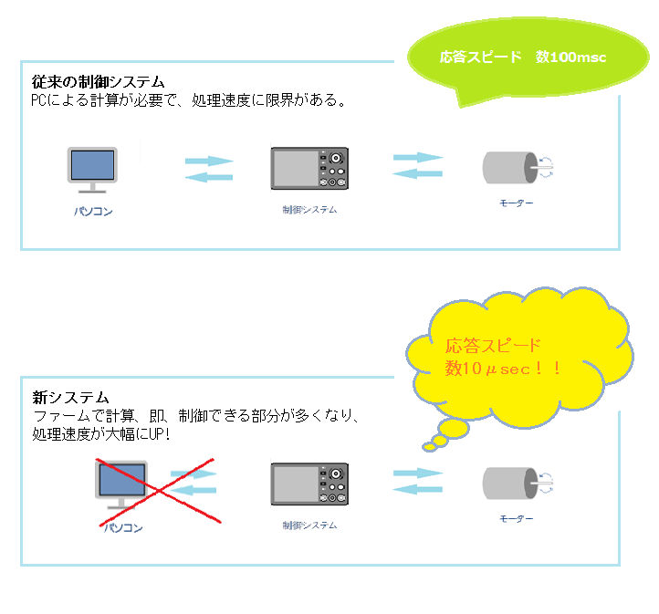 パソコンで制御装置からデータを吸い上げ計算し、制御装置に新しいデータを送るというフェーズをなくすことによって、リアルタイム性の強化された制御を可能としています。